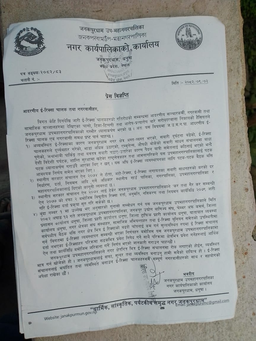 ई रिक्सा संचालनका विषयमा जनकपुरधाम उपमहानगरपालिकाले जा..