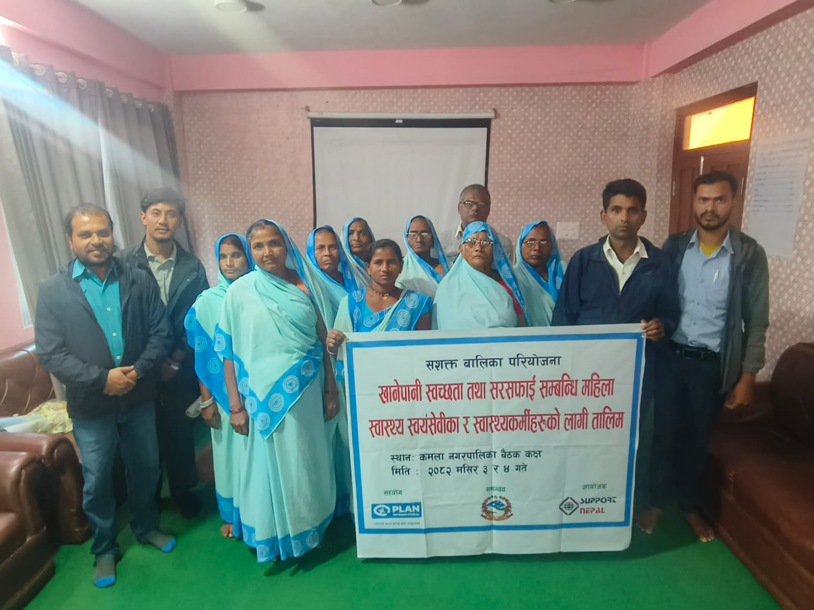 धनुषा जिल्लाको कमला नगरपालिका वडा नंं १ र २ का महिला स्वास्थ्य स्वयंसेविका तथा स्वास्थ्यकर्मीहरुलाई खानेपानी तथा सरसफाई सम्बन्धि दुई दिने तालिम सम्पन्न भएको छ । प्लान इन्टरनेशनल नेपालको सहयोग कमला नगरपालिकाको समन्वय तथा सपोर्ट नेपालको आयोजनामा संचालित सशक्त वालिका परियोजना अन्तरगत स्वास्थ्यकर्मी तथा महिला स्वास्थ्य स्वयंसेविकाहरुलाई सो तालिम प्रदान गरिएको हो । तालिमको समापन सत्रमा बोल्दै प्रमुख अतिथि कमला नगरपालिकाका स्वास्थ्य शाखाका सह संयोजक अमरेश कुमार यादवले तालिममा सिकेका कुरालाई समुदाय, टोल तथा वडामा लागु गर्ने बताउनु भयो ।